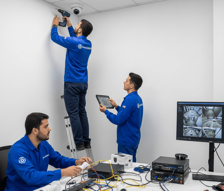 Sistemas de câmeras de segurança IP com gravação em nuvem ou local, acesso remoto e monitoramento 24h.